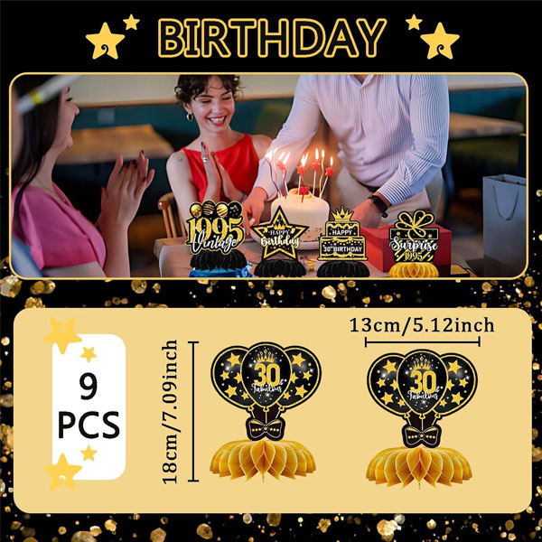 9PCS 30th Birthday Decorations, Retro Black Gold Honeycomb Party Table Decorations, Non-Toxic Waterproof for Men and Women 30th Anniversary Celebrations, 30th Birthday, Anniversary Decorations