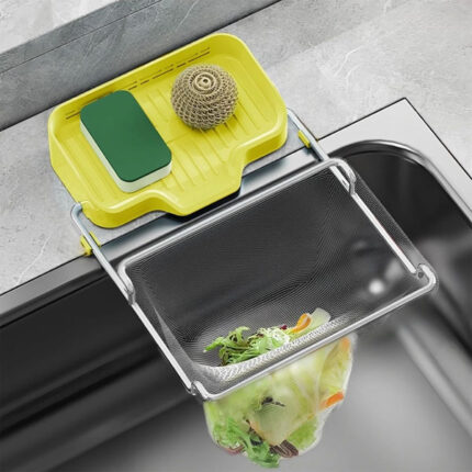Kitchen Sink Strainer, Foldable Food Catcher, Mesh Waste Filter Rack with Detachable Tray, Corner Sink Drain Basket Hanging Dishcloth Holder with 50PCS Filter Mesh Bags (Yellow)