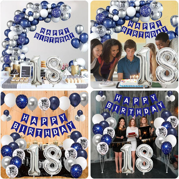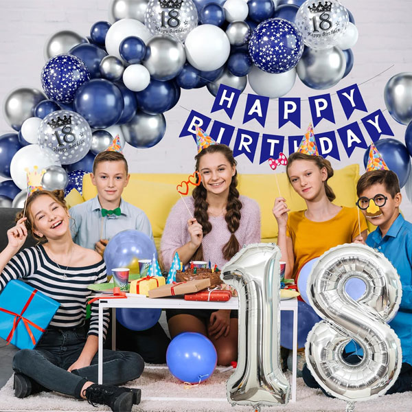 - Package Includes – 18th Blue silver birthday decorations set includes 2 pcs 32 Inch silver number foil balloon(18), 1 pc navy blue happy birthday banner, 5 pcs 12 inch silver 18th confetti balloons, 5 pcs 12 inch navy blue star printed balloons, 45 pcs 10 inch balloons (15 pcs metallic silver, 10 pcs white, 20 pcs navy blue), 30 pcs 5 inch balloons (10 pcs metallic silver, 10 pcs white, 10 pcs navy blue), 1 pc balloon strip, 1 pc dot glue (100 dots), 1 pc ribbon (10M).