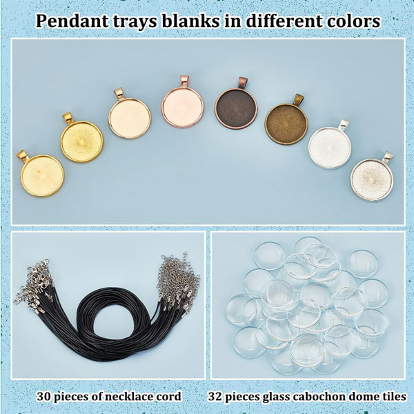 - Package Includes: You will receive 32pcs pendants, 8 colours, 4pcs each, 30pcs necklace cords, 32pcs glass cabochons, a collection of essential elements needed to make necklaces, easy to start the journey of jewellery creation.