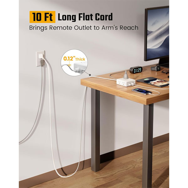 - Flat Extension Cord 10 ft: With an ultra thin flat head (only 0.3 inches), our flat plug power strip can easily fit in tight spots and hide behind furniture (sofa / bed / nightstand) with wall-flush alignment; The 45° right angle plug creates extra space for other receptacles below without blocking.