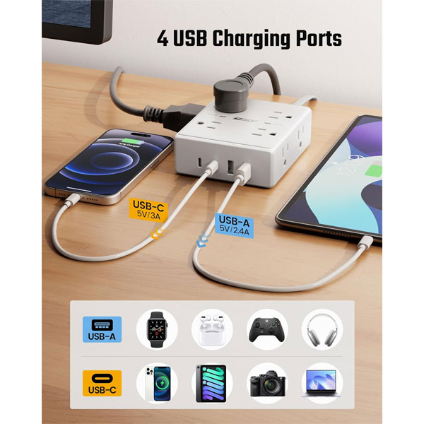 - Power Strip with USB C: 2 USB-A (5V/2.4A) and 2 USB-C (5V/3A), with a total USB output up to 15W. This USB charging station can auto-detect charged devices’ power draw and deliver optimal charging speed, compatible with all USB-powered devices like cell phones, earphones, tablets, smart watches, etc.