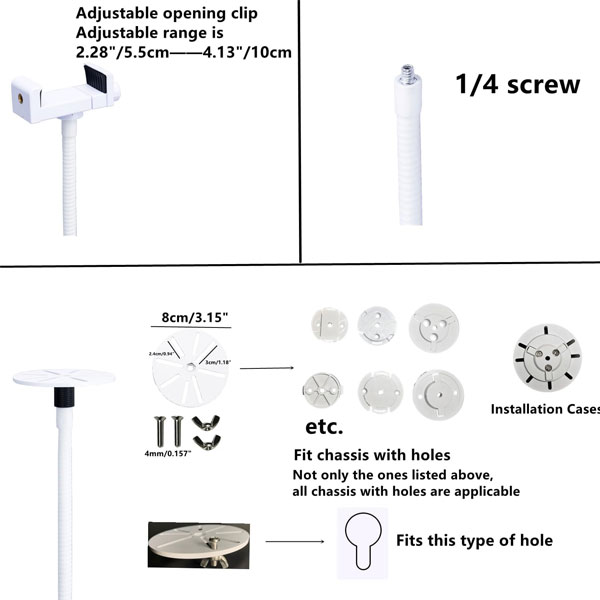 - Suitable for CCTV cameras: 1. Camera with 1/4 screw hole; 2. Clamp opening is 2.16-10.5 inches/5.5-10.5 cm.
