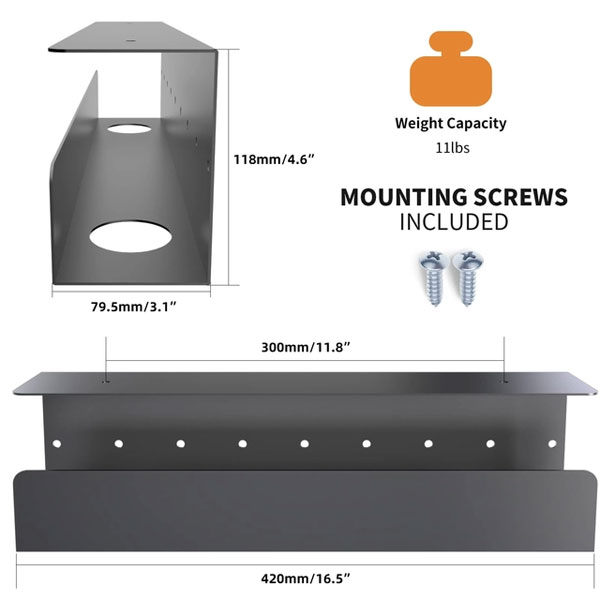 - Large 420mm Cable Tray – 420mm long, 76.2mm wide, 114.3mm high, 1.5mm thick, this metal holds cables, wires and power strip up to 5kg.
