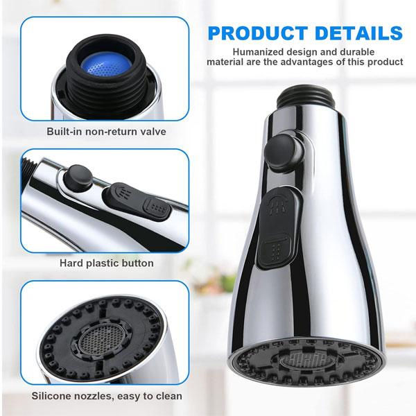 - 【3 WATER OUTPUT MODES】The kitchen sink nozzle has flow mode, spray mode and dual Aquablade mode. Just press the switch button,the replacement kitchen spray head can switch to the mode you want. It can fully meet different needs of washing.(Note: The mode switch button only works when there is water pressure, that is, the mode can be switched after the installation is completed.)