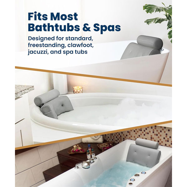 - VERSATILE FIT FOR ANY TUB OR SPA: Designed to adapt to nearly all bathtub shapes, this bath pillow fits standard, freestanding, straight-back, and rounded tubs with ease. It’s also suitable for hot tubs, jacuzzis, or soaking baths, making it a versatile choice among luxury bathroom accessories. Whether updating your bathroom essentials or creating a spa-inspired setup, it delivers comfort and support for women, men, and adults in any bathing space
