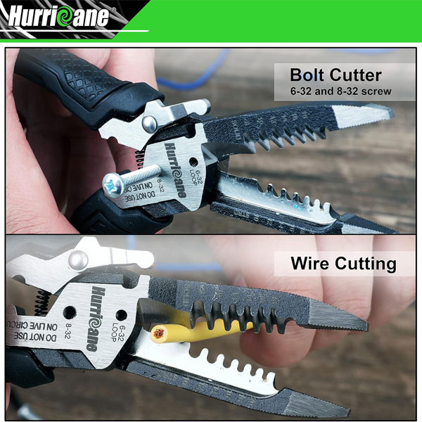 - 【All-IN-ONE Wire Stripping Tool】 These Heavy Duty Hurricane 6-in-1 pliers feature a wire stripper, wire cutter, reamer, bolt cutter, crimper. Wire Stripper with six stripping holes for 8-18 AWG solid and 10-20 AWG stranded wire.