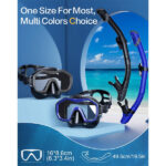- CLEAR PANORAMIC SNORKEL MASK: The snorkeling mask is equipped with an anti-fog film to prevent the lenses from fogging when the nose exhales. The impact-resistant tempered glass can well withstand deep water pressure and provide protection. Safety comes first.