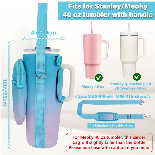 - Compatible With:The water bottle carrier Bag compatible with Stanley/Meoky 40 oz/Simple Modern/BrüMate 40 oz Era Tumbler with Handle(Note:Due to long term transportation and material,There is maybe slight odor, don’t worry,the odor will dissipate in a few hours in a ventilated place)