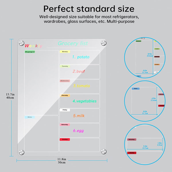 - 【Clear 11.8×15.7″ acrylic board 1 set】 Includes 1x 11.8×15.7″ clear weekly magnetic acrylic board, 6x markers, 6x anti-scratch gaskets, 6x hanging hardware and 1x plastic remover. Use strong magnets to ensure that the acrylic planner does not move during use.