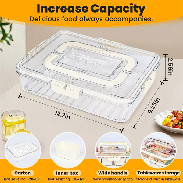 - The snack tray with lid of the fruit has a subtle storage design,you can open the transparent plastic plate and put 8-10 disposable fruit forks inside, you and your friends can always have fresh fruits when you carry the picnic box out for picnic and travel. Categorizing the cutlery can also make your snack tray more neat and beautiful.