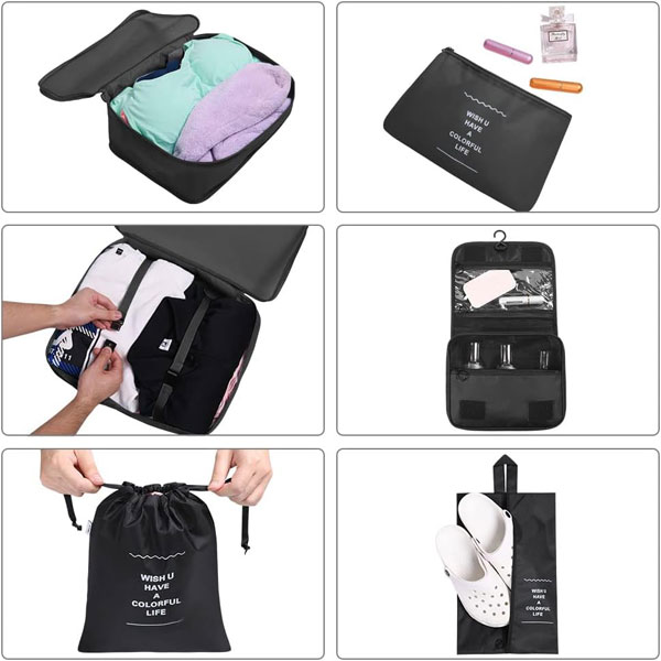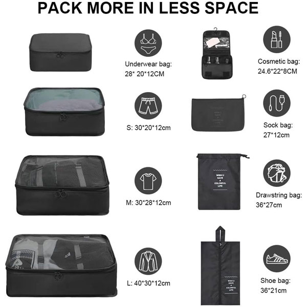 - ❤ Super Value Travel Packing Set: include 3 travel packing cubes with see through mesh top for clothes, 1 drawstring pocket, 1 underwear bag, 1 flat pocket, 1 shoe bag, 1 wash bag.