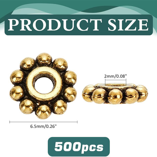• Package Includes: You will receive 500pcs antique golden spacer beads, the quantity is enough to meet your DIY needs. Size: About 6.5 mm in diameter, hole: 2 mm, can be used as spacers or decorations in different designs according to the size