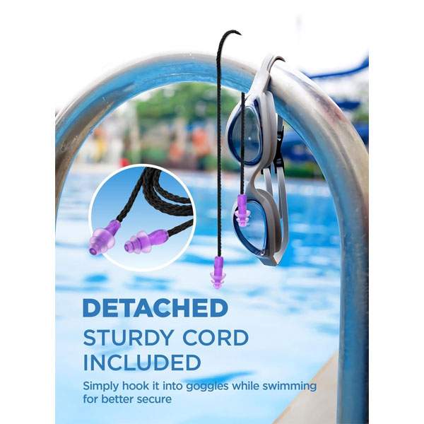 - FLOATABLE & REMOVABLE CORD: These swimming earplugs are lightweight and float on water, so if they fall out while swimming, you can easily find and reuse them. The removable cord keeps them together and provides extra ear protection for swimming