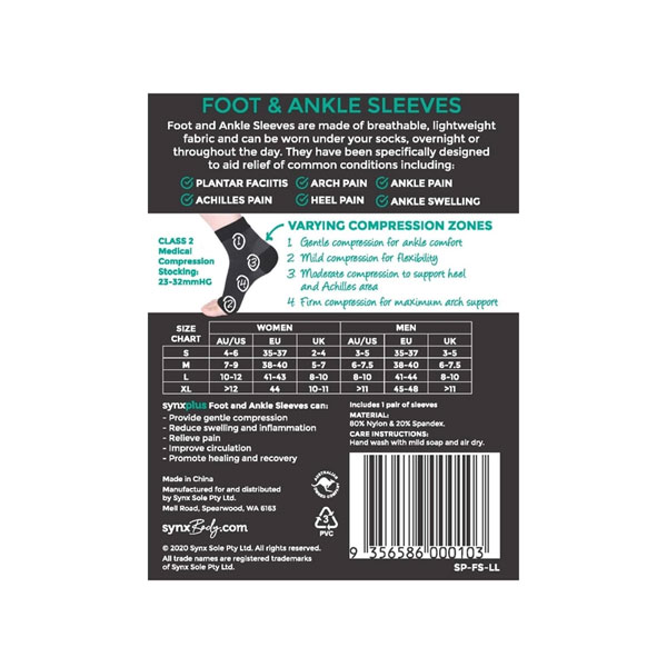 - ERGONOMICALLY DESIGNED FOOT SLEEVES- Our SynxPlus ankle compression sleeves were designed by two Australian Podiatrists to provide heel pain relief. Perfect compression sleeves for arch support to improve blood flow. Feel good, move more.