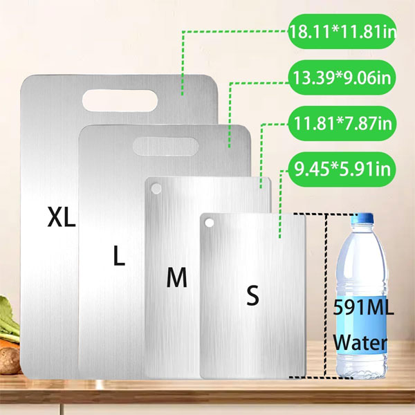 - Durable & Safe Stainless Steel Cutting Board – Made from 304 stainless steel and titanium alloy cutting board offers a non-porous, food-safe surface that resists odors, stains, and microplastics. Unlike wooden or plastic options, our stainless steel cutting board for kitchen ensures a cleaner and more hygienic food prep experience.
