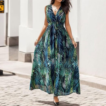 Yutdeng Womens Summer Dress Floral Maxi Dress Sleeveless V Neck Dress Ladies Long Flowy Boho Beach Dress Drawstring Backless Beachwear Casual Dresses,Blue,XXL